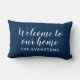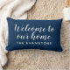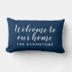 O travesseiro lombar azul e branco do marinho moderno "Bem-vindo a Nossa Casa" apresenta texto de script na moda com texto de monograma sans serif personalizado que pode ser personalizado com o sobrenome da sua família. Estão disponíveis tecidos para travesseiros interiores e exteriores.