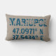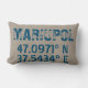 Modern throw pillow design with features latitude and longitude coordinates for Mariupol, Ukraine in distressed dark blue font  on taupe background