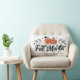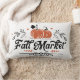 Este travesseiro ao estilo da fazenda apresenta um design de abóbora com as palavras "Fall Market". Na parte de trás está um padrão de gingham preto e branco.