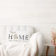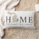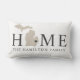 O travesseiro na moda de boas-vindas apresenta um design de tipografia com texto "Home" e mapa do estado de Michigan. O marcador de cidade do coração preto suave / onyx pode ser posicionado sobre a cidade onde você mora via Personalizar. Personalize com seu monograma familiar ou seu nome de cidade. Cor bege, preto suave e branco. Um padrão de listras horizontais veste a parte de trás do travesseiro.