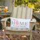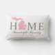 O travesseiro de boas-vindas apresenta o texto "Home" com o mapa do estado de Michigan e o texto personalizado que pode ser personalizado com o seu nome de família e a cidade, indicar onde você mora. O marcador da cidade do coração pode ser movido para o local apropriado por meio de Personalizado. As listras horizontais vestem o lado inverso. Cinzas, cor-de-rosa e branca.