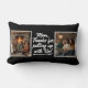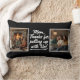 This decorative lumbar pillow features the "Mom, thanks for putting up with us" message in elegant brush script, flanked by two large customizable photo panels. The elongated design provides ample space for both the humorous text and clear, high-quality family photography.