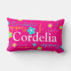 Um aqua azul verde-claro-claro-claro, amarelo e branco com um padrão personalizado de até 8 letras travesseiro. Personalize com seu próprio nome, lendo atualmente Cordelia. A cor de fundo também pode ser alterada se for necessário, atualmente rosa-quente brilhante. Um presente perfeito para as meninas personalizarem seu quarto. Arte original e design por Sarah Trett exclusivamente para www.mylittleeden.com
