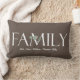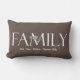 Travesseiro familiar com nomes próprios. Fácil de personalizar usando o botão personalizar. A palavra FAMILY tem um design de folha de eucalipto sobre fundo castanho. Este travesseiro moderno e minimalista ajustado a maior parte da decoração doméstica.
