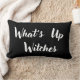 Travesseiro branco e preto com tipografia. O texto diz: "O que há lá dentro bruxas". Esta porta festiva e divertida é perfeita para outubro e Halloween. Mat é preto e a tipografia é uma escrita branca.