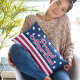 Travesseiro Patriótico com a bandeira dos Estados Unidos com suas estrelas e listras em vermelho, azul e branco, com a legenda Americano Orgulhoso em uma fonte vermelha moderna com uma fronteira branca.