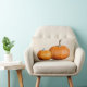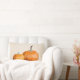 Duas bombas de colheita de laranja de ouro, prontas, de diferentes formas, com caules castanhos claros sobre um fundo de tecido de cor de farinha de aveia texturizada com losango. Aperte o seu decor de outono com este travesseiro quente e convidativo!