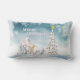 Nosso travesseiro favorito - um travesseiro lombar confortável - com um tema de Natal adorável, um trio de ursos polares, apunhalados em acessórios de inverno e prontos para celebrar o Natal na neve, próximo a uma árvore de Natal com as palavras Feliz Natal em caracteres negros.