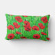 Travesseiro lombar em meio abstrato, padrão aquoso de papoila vermelha em um campo, contra caules e folhas verdes