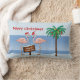 Feliz Natal engraçado de um clima quente ou de um local tropical. Divertido e caprichoso. 2 flamingos cor-de-rosa estão na praia, na areia branca, vestindo chapéus de Papai Noel, e parados por uma palmeira decorada com luzes de férias, com as ondas do oceano no fundo. Um cartaz engraçado preso na areia diz, Polo Sul Tropical. As opções, Feliz Natal ou o sinal na areia podem ser apagados se desejado para um design mais simples, ou mudar de texto se ajustado a área ou para o Polo Norte Tropical. Backside é a cor azul clara do céu para corresponder à frente, ou mudar para branco ou qualquer cor.