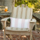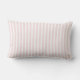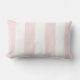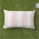 Este travesseiro listrado cor-de-rosa e branco tem uma estética de Palm Beach tendeny quando combinado com um padrão de folha tropical.