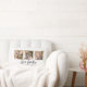 Travesseiro com as palavras "Nossa Família" em um estilo de letra elegante com 3 fotos quadradas dispostas lado a lado na frente e no verso, totalizando 6 fotos que você pode substituir com suas próprias fotos em um fundo branco. Você também pode adicionar o nome da sua família e o ano de fundação. Perfeito para decoração de casa, recém-casados, lembranças da família, etc.