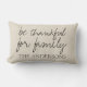 Um travesseiro decorativo no bege natural neutro com a expressão "seja grato para a família" impressa no roteiro moderno e em seu nome de família feito sob encomenda em letras tipográficas para um interior moderno do estilo da casa da quinta. É fácil personalizar usando a área do modelo fornecida.