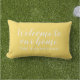 O travesseiro lombar moderno amarelo brilhante e branco "Bem-vindo a Nossa Casa" apresenta texto de script de na moda com texto personalizado de sans serif monograma que pode ser personalizado com o sobrenome de sua família. Estão disponíveis tecidos para travesseiros interiores e exteriores.