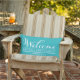 design de travesseiro exterior na moda apresenta "Bem-vindo" no escrevendo de script branco moderno com nome de família personalizado texto e sotaque decorativo de rolagem. A cor azul-turquesa de fundo que pode ser personalizada para coordenar com a sua decoração.