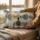 This serene artwork captures a quiet moment of solitude and reflection as a young woman sits peacefully on a wooden bench, gazing out over a calm lake bathed in golden sunset light. Surrounded by lush trees and blooming wildflowers, the scene evokes a tranquil cottagecore charm, blending soft watercolor textures with gentle lighting. Warm hues of amber and pastel greens complement the dreamy glow of the setting sun, while delicate shadows stretch across the water’s surface. The composition invites viewers into a world of quiet contemplation, wrapped in nature’s embrace. AI generated artwork.