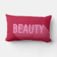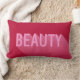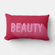 Travesseiro rosa com um desenho abstrato moderno da palavra "Beleza" com um longo gradiente de sombra. Adicione um toque divertido à sua casa ou à sua sala com este travesseiro moderno. *Observe que a Marca d'água do Zazzle que aparece na visualização de zoom NÃO aparecerá no produto impresso final. © Rosewood e Citrus