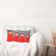 Travesseiro decorativo com a imagem das bonecas nidificantes russas contra um fundo preto e branco na frente e bolinhas vermelha no verso.