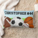 Travesseiro de sotaque na cama central para o quarto de menino. Cena ao ar livre com uma série de bolas esportivas. O travesseiro divertido e desportivo apresenta bolas de esporte, incluindo futebol, basquete, beisebol, almofada de lança para crianças bonitas para um adolescente, meninos de criança ou quarto para crianças, decoração personalizada para qualquer atleta ou estudante segundo grau.