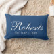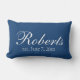 Um travesseiro decorativo bonito dos azuis marinhos personalizado com o nome de família e a data de sua escolha. Mude a cor do fundo ou deixe-a azul escuro. Um travesseiro feito sob encomenda bonito e moderno do lance para adicionar um toque pessoal a alguma sala.