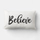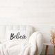 Acreditem na escrita manual | Travesseiro decorativo de férias com padrão de xadrez de búfalo preto e branco no verso. Design de tipografia moderna de uma fazenda feita por Blackberry Boulevard "Acredite", escrita em uma fonte preta em um fundo branco sólido. Outras cores disponíveis no armazenamento. Travesseiro de sotaque perfeito para sua decoração de casa de férias.