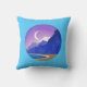 Travesseiro em ilustração circular de lua crescente, margem do lago, colinas e cordilheiras, em tons de azul profundo e violeta