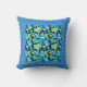 Um Travesseiro decorativo ou Cushion com um padrão abstrato de 'Luas Azuis' em blues brilhantes e verde neon em fundo preto, bordado por um padrão de Bolinhas coordenadora. Parte da coleção Posh & Painterly 'Blue Moons'; de um design de colagem de papel pintado à mão por Judy Adamson.