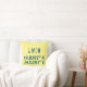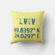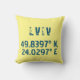 Design moderno de almofada apresenta coordenadas de latitude e longitude para Lviv, Ucrânia em fonte azul escura desgastada em fundo amarelo