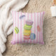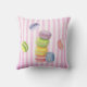 Um travesseiro delicioso com uma design de aquarela rico de doces e deliciosos macarões franceses empilhados uns sobre os outros e alguns também estão se desmoronando. Bonito cores pastéis - roxo, verde limão, amarelo, rosa e azul. Definido em um plano de fundo listrado rosa.