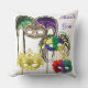 travesseiro decorativo de 20" x 20" com uma imagem de quatro máscaras coloridas Mardi Gras adornadas com penas brilhantes, sequelas e brilho em branco. Texto opcional. Roxo para trás. Veja toda a coleção de Travesseiros Mardi Gras no DECOR | Seção Travesseiros.