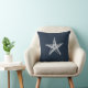 Travesseiro decorativo marítimo único e elegante. Este design apresenta uma ilustração de um caranguejo branco e uma imagem de um peixe-estrela branco sobre um fundo azul marinho. Escolha seu tecido e tamanho favoritos e comprar-o agora ou dê-o como um presente perfeito para um amante do mar.
