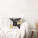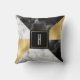 Travesseiro decorativo de sotaque monograma moderno feito em um padrão geométrico de folha de cor dourada, mármore branco e mármore preto. Um quadrado preto e dourado, no meio do travesseiro, tem um monograma branco de letras solteiros pronto para personalizar. Adorável decoração doméstica e faz uma ideia de presente de excelente.