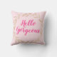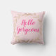 Travesseiro decorativo branco-rosado-rosa-claro-cinzento com as palavras "Hello Gorgeous" em um elegante roteiro rosa-quente.