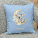 Este travesseiro personalizado para meninos apresenta um bebê coala fofo enrolado dormindo em uma lua crescente com estrelas brilhantes em um fundo azul pastel caprichoso.