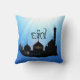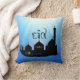 Silhueta negra de uma mesquita num céu azul com sol e raios solares, saudações e desejos para Eid.