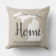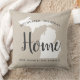O travesseiro de boas-vindas apresenta um design de tipografia com texto de script "Home" e mapa do estado de Michigan. Personalize com seu monograma de cidade e família. bege neutro preto suave e branco. Um padrão de listras horizontais veste a parte de trás do travesseiro.