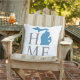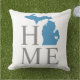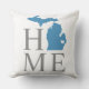 O travesseiro na moda de boas-vindas apresenta um design de tipografia com texto "Home" e mapa do estado de Michigan. O marcador da cidade do coração pode ser posicionado sobre a cidade onde você mora via Personalizar. Cinzas de carvão, cor azul e branca. Um padrão de listras horizontais veste a parte de trás do travesseiro.