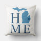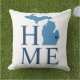 O travesseiro de boas-vindas apresenta o texto "Home" com o mapa do estado de Michigan. O marcador da cidade do coração azul marinho pode ser posicionado sobre a cidade onde você mora via Personalizar. Marinho, azul e cores brancas. Um padrão de listras horizontais veste a parte de trás do travesseiro.