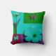 This modern floral pillow showcases oversized pink flowers set against bold, geometric color blocks.