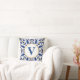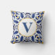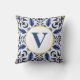 Um tradicional design "Azulejo" de Flor Azul Espanhol num travesseiro. Um visual de eterno vintage que está sempre no estilo. Este é um sotaque de excelente para os motivos decores europeus ou espanhóis. Uma letra monográfica para um toque pessoal é fácil de personalizar. Este é um chá de panela excelente ou presente de casamento!