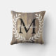 Peguem aquele estilo quic e rústico da fazenda com este travesseiro decorativo com um fundo de plâncias de madeira leves com louros brancos. Ele também tem sua escolha de letra monográfica personalizada no nome da família preto e cheio em script branco.