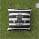Fundo preto e branco largo das listras do descanso listrado preto e branco moderno, náutico do monograma. São centrados um olhar metálico, uma âncora náutica da cor de prata com uma inicial do monograma na cor de prata cinzenta, uma rotulação moderna moldada dentro de um preto e um quadrado de prata metálico do falso. Idêntico em ambos os lados. Decoração exterior na moda, mas clássica para uma casa de praia, casa de férias do verão, casa do lago, barco de casa, ou cabine nas madeiras, ou simplesmente em sua própria decoração do pátio ou da plataforma do quintal. Presente elegante, monogrammed do housewarming ou presente para a família ou para newlyweds para um chá de casamento. Não apenas para o ar livre, você pode obter este travesseiro preto e branco em tamanhos e em opções diferentes de pano para a decoração preto e branco moderna ou o acento monogrammed da decoração do quarto. Nós temos TRAVESSEIROS E A DECORAÇÃO NÁUTICOS de COORDENAÇÃO, assim como muitos outros estilos populares, na moda em nosso Zazzle.com/angela65 compram.