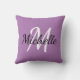 Travesseiro decorativo com fundo roxo e primeiro nome e monograma personalizado branco.