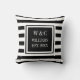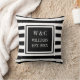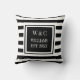 Elegante almofada de lançamento com iniciais personalizadas monograma apresentando um padrão de faixa preta e branca com suas iniciais e nome da família com a data estabelecida em um quadrado com borda preta e texto branco clássico. Criado por Thisisnotme©