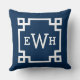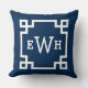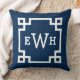 design na moda e travesseiro de sotaque quadrado moderno apresentam um design e um monograma de quadros geométricos de borda grego que podem ser personalizados. Cores azuis e brancas vibrantes do marinho. A cor de fundo pode ser modificada.