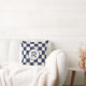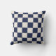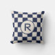 Na frente do travesseiro de padrão verificado com marinho e creme, há um círculo bege com um monograma personalizado no centro. Adicione a sua inicial na barra lateral. Alternando quadrados azuis e esbranquiçados marinhos do padrão geométrico em negrito atrás dele. Para ver mais itens Marinho e Creme verificados, clique no link "Artes Rocklawn".