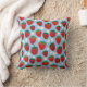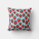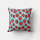 Um doce padrão repetido de morangos suculentos e as flores brancas da planta estão espalhadas por um fundo azul-céu. Este travesseiro de decoração em casa é uma adição divertida ao seu pátio de verão, celebrações temáticas, infantários, cozinha e muito mais.