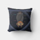 Um pequeno morcego marrom fofo com olhinhos amarelos grandes, usa uma gravata borboleta laranja elegante e fica pendurado de cabeça para baixo na borda de um celeiro antigo. Olhos misteriosos coloridos olhando para frente e para trás habitam o fundo azul meia-noite. Ilustração original de Noël Snow
