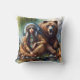 Uma mulher nativa americana sentada pacificamente por um rio, enfeitiçada em trajes tradicionais, ao lado de um urso majestoso, mostrando harmonia com a natureza.