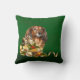 O dachshund vermelho de cabelos compridos com presentes do Natal persegue o travesseiro decorativo do feriado dos amantes.